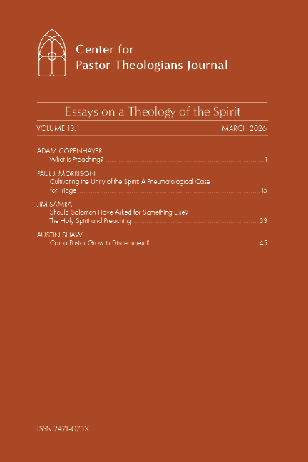 Paul J. Morrison, “Cultivating the Unity of the Spirit: A Pneumatological Case for Triage,” Center for Pastor Theologians Journal 13.1 (March 2026): 15–31. https://www.pastortheologians.com/academic-articles/cptj13-1/cultivating-the-unity-of-the-spirit
